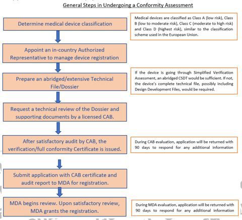All class B, C, and D medical devices must first undergo conformity assessment before they can be submitted for evaluation with the MDA. Owing to low risk potential, class A medical devices have been exempted from being conformity-assessed by a CAB prior to submission with the MDA.